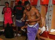 On savait Grégory Coupet proche de la culture rugby. Le gardien du PSG a pris certaines habitudes d’après-match des rugbyman en sirotant une petite bière dans le vestiaire. Siaka Tiéné, lui, n’a pas trop de deux portables pour raconter sa minute de jeu, lui qui est rentré à la 89e minute. Mais Apoula Edel (de dos) fait encore plus fort. Serviette lovée sur les hanches, il raconte son match (vu du banc) à ses amis. A moins qu'il ne soit avec son avocat...
